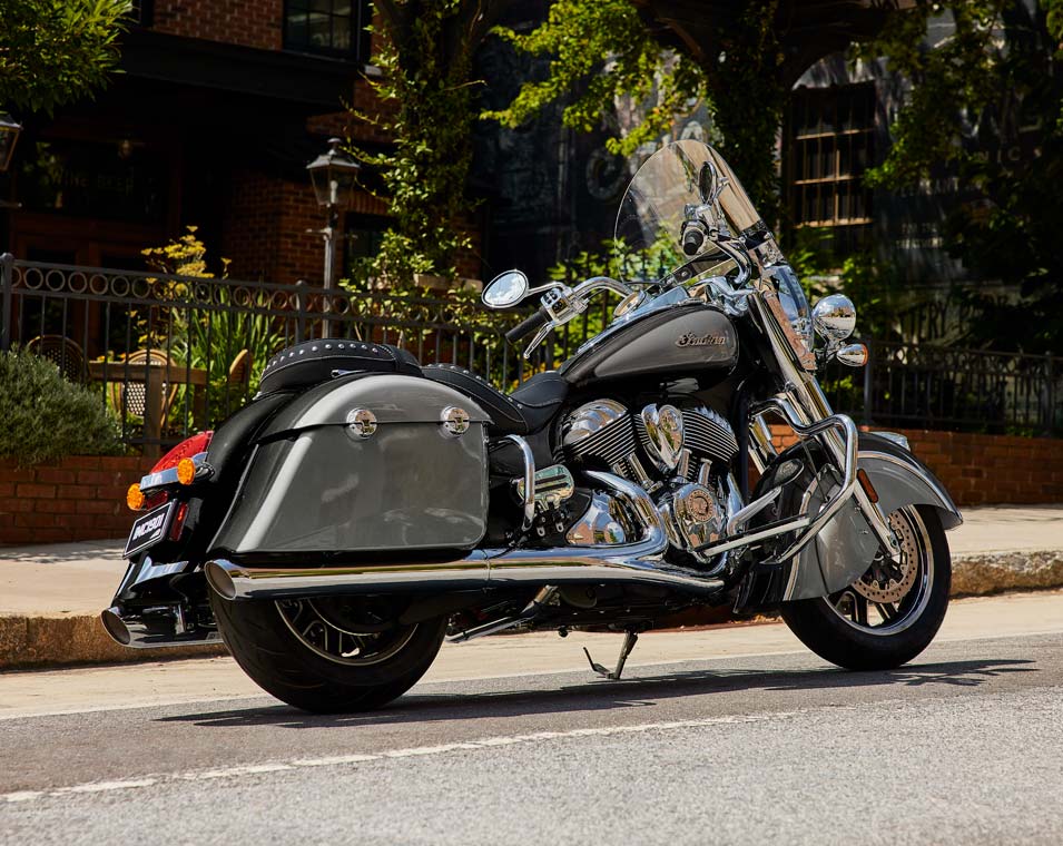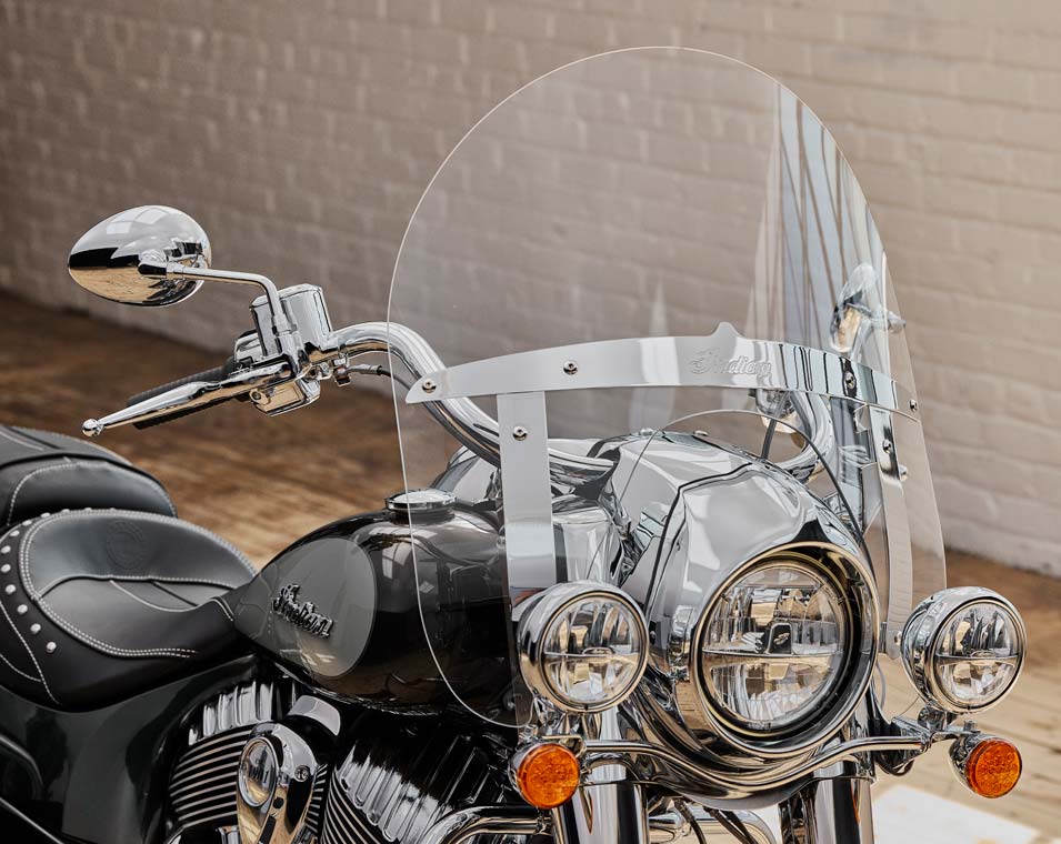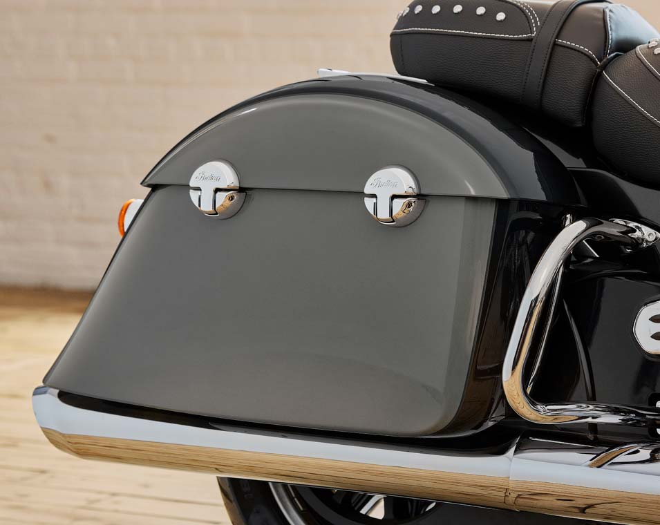 | Standard Equipment | Quick Release Windshield; Genuine Leather Seat; Remote-Locking Hard Saddlebags, Highway Bars; Tyre Pressure Monitoring; Light Bar; Selectable Ride Modes, ABS; Cruise Control; Keyless Ignition; Indian® Script Tank Badge; 12v Charging Port |