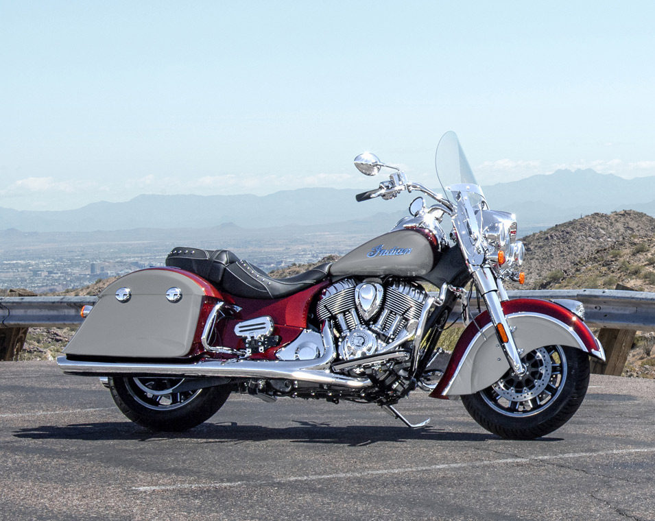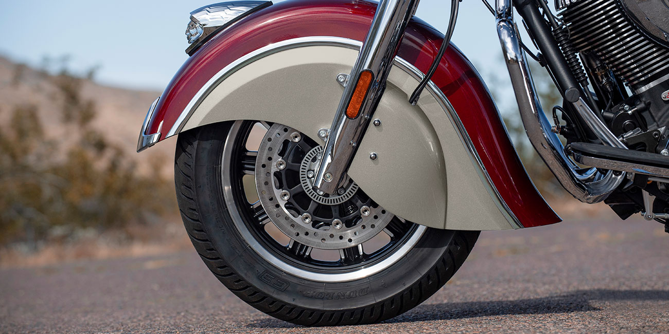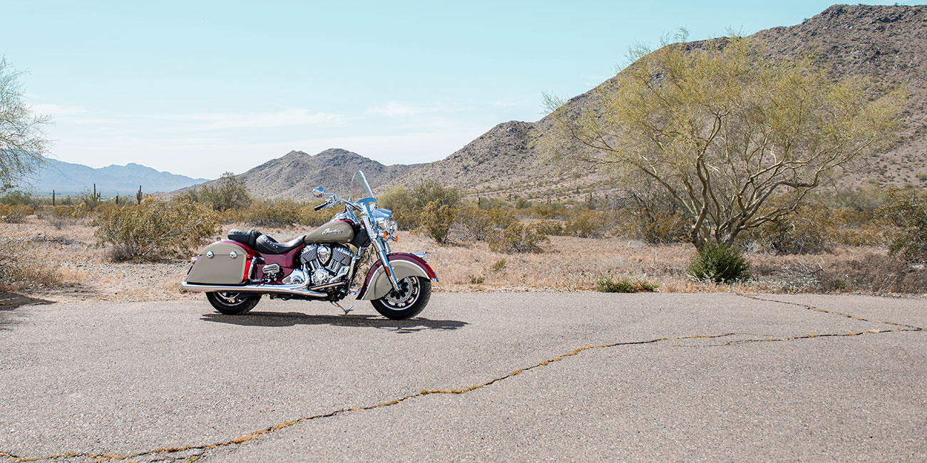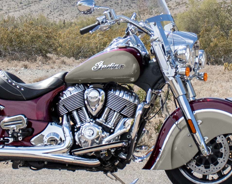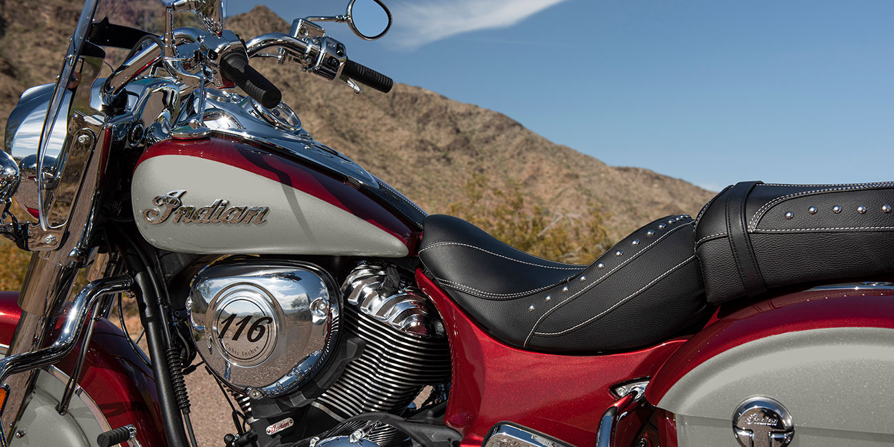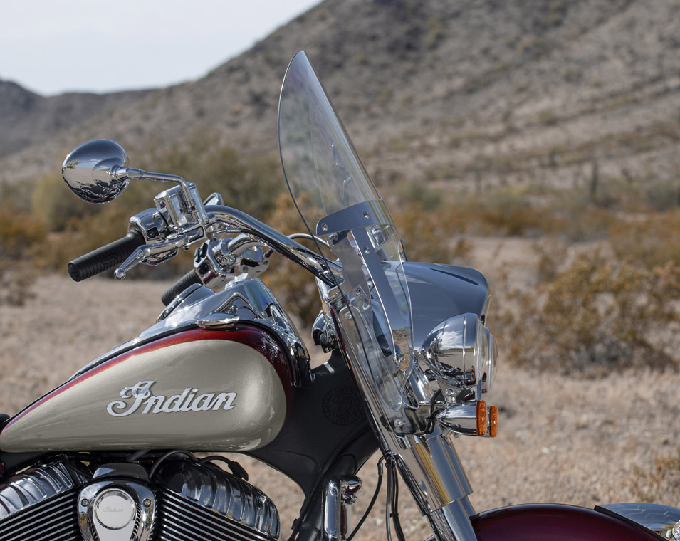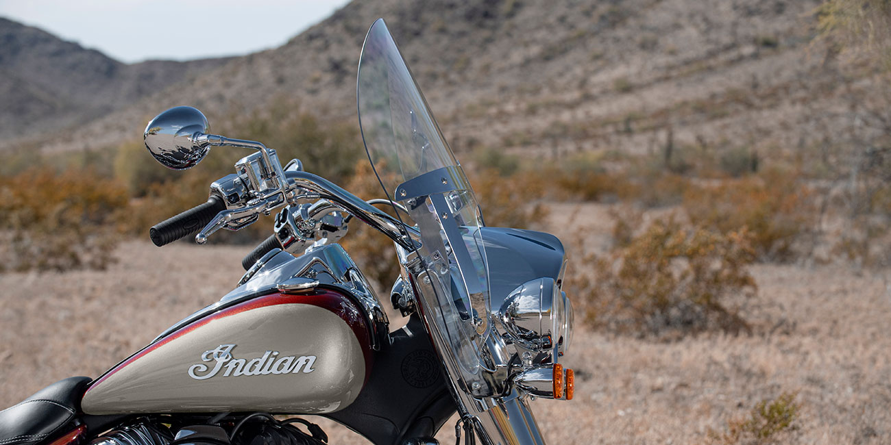| Standard Equipment | Quick Release Windshield, Remote-Locking Hard Saddlebags, Highway Bars, Tire Pressure Monitoring, Selectable Ride Modes, ABS, Cruise Control, Keyless Ignition, Indian® Script Tank Badge, 12v Charging Port |